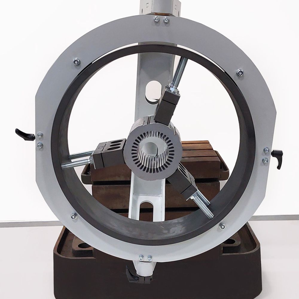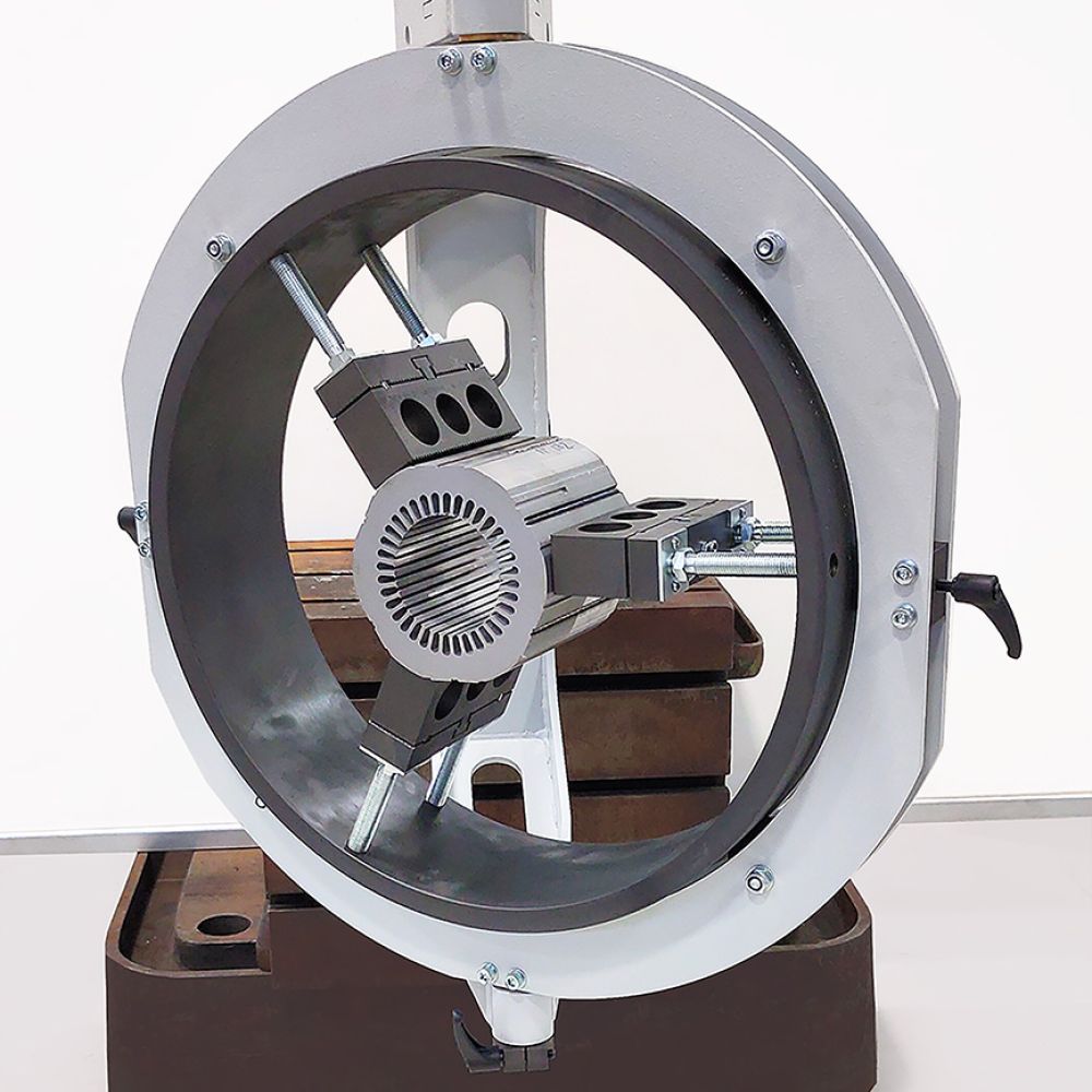 Estructura central sólida con 4 soportes giratorios en los extremos; 2 de los 4 soportes son motorizados y permiten la rotación del anillo de bloqueo del estator.